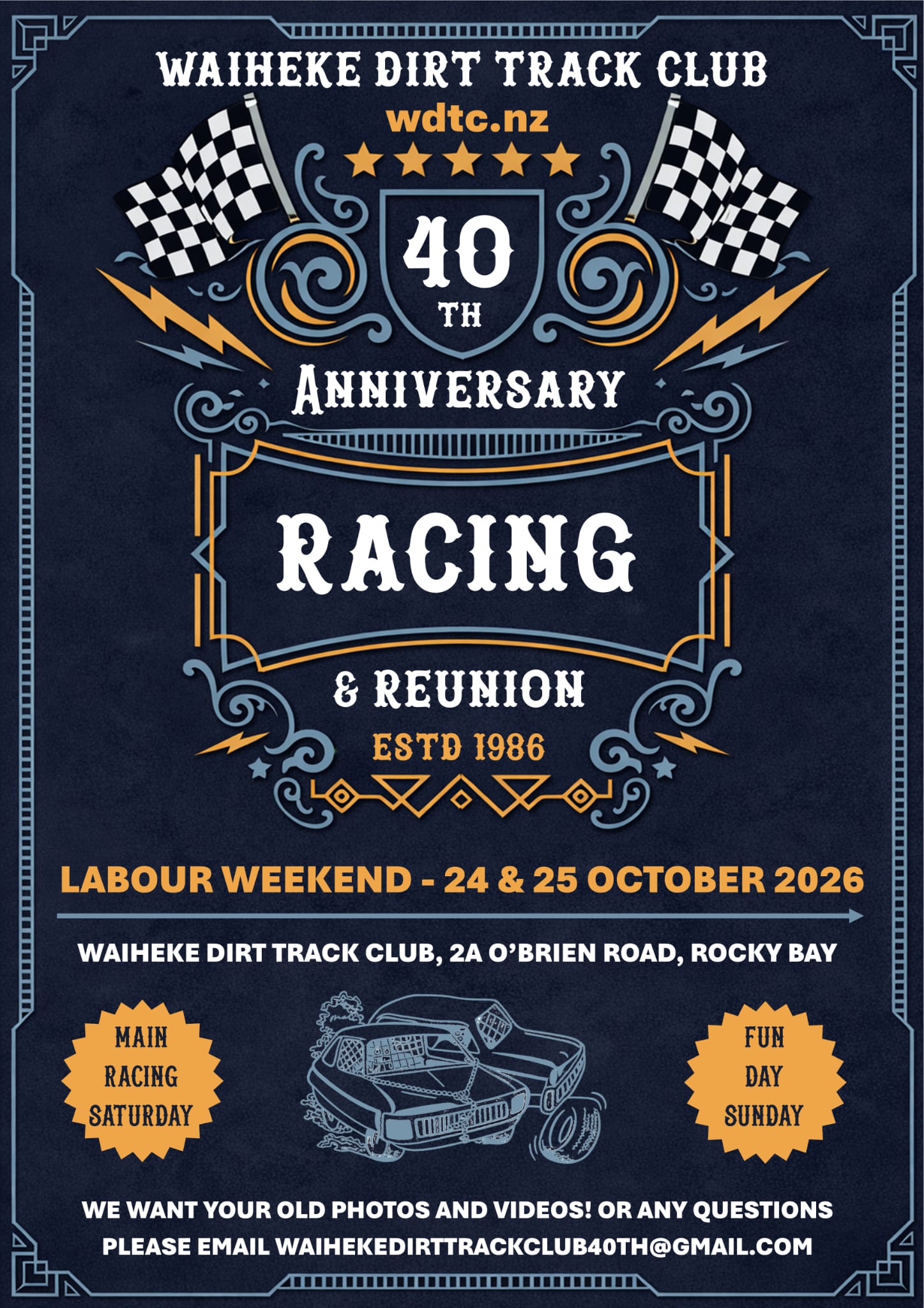 Waiheke Dirt Track Club started in 1986 when the club bought the land we now know as the Dirt Track. The track was formed about then and is now a great clay oval track. Things progressed from an unofficial "paddock bash" drive around a field to a clay formed race track with a tower, pits and concrete protection. The club grew and more and more cars entered and the competition became more and more exciting. The farmer that owned the land at 2a O'Brien rd then decided his time was up. He offered the site to the club and threw in the woolshed. The real excitement began. The club was born. The woolshed was converted to the bar and clubrooms you see today, the track became even better - A lot of hard work. Our sister club - Waiuku - was formed at about the same time and lots of visits and interclub competitions started. We are still very welcome at Waiuku and visits to their track and welcomed with open arms.